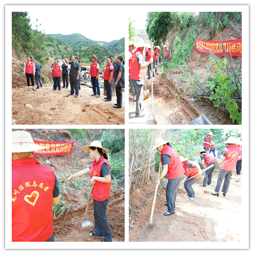 细坳镇半径村是龙川县法院挂钩帮扶村,在“6.10”、“6.12”洪涝灾害中,造成多处山体滑坡,泥土掩盖村道,影响村民出行。龙川县法院积极响应县委号召,开展“灾后重建、我作贡献”主题党日活动,组织党员干警前往半径村清理道路、沟渠淤泥,疏通灌溉水渠,铺设引水管道,尽快帮助群众恢复生产生活。